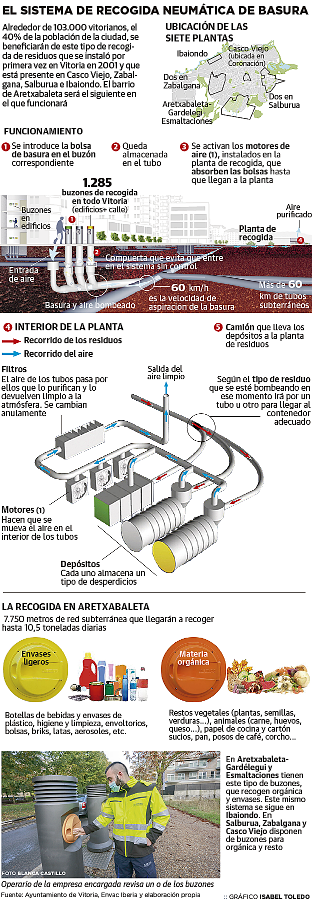 Más de 60 kilómetros de tentáculos subterráneos conectados a una serie de «aspiradoras gigantes» se 'tragan' a diario los desechos que generan cerca de la ... mitad de los hogares vitorianos. Un 'monstruo de las basuras' que no tiene nada de monstruoso y que de hecho ha colocado a la capital alavesa como una de las pioneras a nivel nacional en el sistema de recogida neumática de residuos. Esta gran red continúa en expansión y se 'enciende' a partir de hoy (19 de octubre), en los barrios del Sur, donde 900 hogares de Aretxabaleta, Gardélegui y Esmaltaciones podrán estrenar al fin, tras varios años de espera, los receptáculos ya presentes en el Casco Viejo, Ibaiondo, Salburua y Zabalgana. Entre todos esos distritos se reparten las siete plantas centrales del sistema de recogida al que están enganchados más de 100.000 vitorianos (el 40% de la población), según datos municipales.