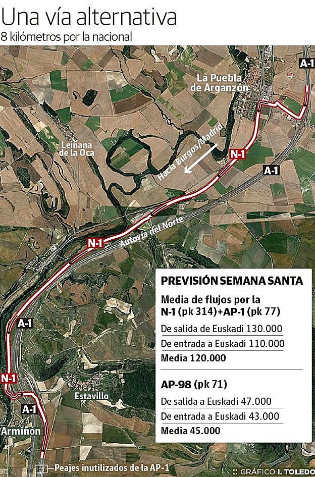 Un recorrido prácticamente paralelo de ocho kilómetros por la vieja carretera que 'nace' a la altura de La Puebla de Arganzón y se reincorpora a la moderna autopista antes de los peajes inutilizados de Armiñón. En todo caso, con este plan coordinado con la Diputación de Álava y el cuerpo de Miñones no se entrará en las áreas urbanas del Condado de Treviño. Una alternativa que hasta el momento existía, pero a la que muy pocos recurrían por lo que se han instalado señales especiales. En la 'operación salida' se habilitarán señales provisionales para recomendar el desvío por la Nacional y en la de 'retorno', por su parte, se colocarán conos y otra clase de elementos para garantizar la incorporación segura de quienes vienen de la AP-1 a la A-1 sentido Vitoria.
