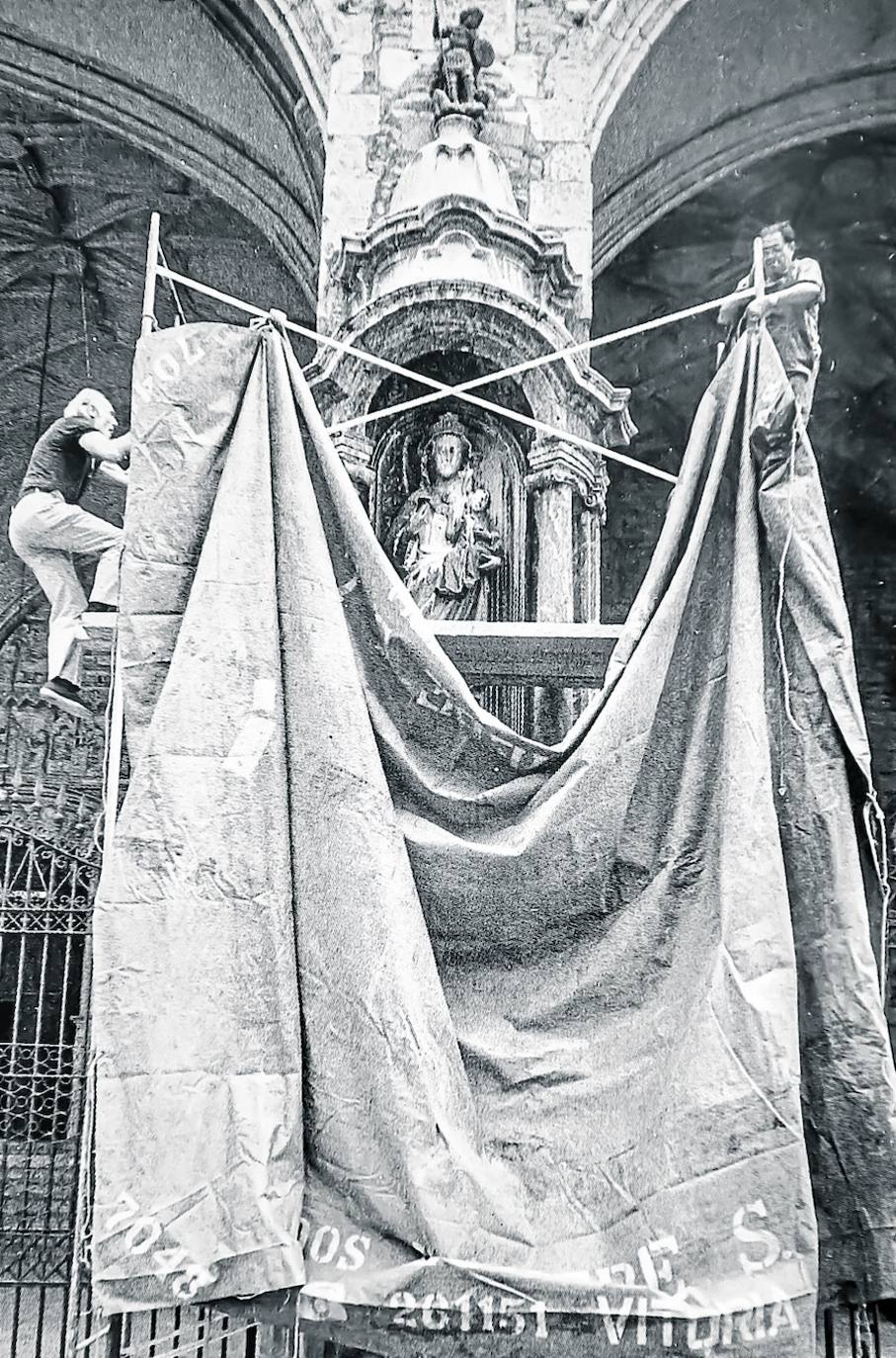 La mañana del 25 de julio de 1984, fecha señalada en el calendario festivo vitoriano, se despertó sobresaltada por un ataque vandálico, el tercero en ... apenas dos años, a la hornacina de la Virgen Blanca. La patrona y el Niño que sostiene en su rezago aparecieron embadurnados con pintura blanca arrojada al alba por algún iconoclasta desaprensivo. La talla recibió tres impactos, uno en la cabeza del pequeño, otro bajo el brazo derecho de la madre y un tercero en lo alto del arco. Dos horas después, en la plaza de España, la Policía Municipal detuvo a un joven de 28 años supuestamente autor del incidente, delatado por un limosnero de San Miguel que aseguró haber presenciado el lanzamiento del esmalte.