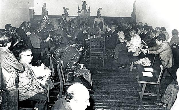 Las Juntas Generales de Álava llevaron al Ayuntamiento de Salvatierra la celebración de su primer pleno una vez constituidas democráticamente tras las elecciones municipales. Hubo de derribarse un tabique y acondicionar el salón municipal para dar cabida a los más de cincuenta procuradores de las hermandades, otras autoridades y público asistente a la histórica cita el 27 de mayo de 1979 (en la foto). Como primer acuerdo, el parlamento alavés aprobó una moción de PNV, PSOE e Independientes que solicitaba la paralización de las obras de la central de Lemóniz (Vizcaya). La apoyaron los tres grupos firmantes (33 votos), con la abstención de UCD (14). En el mismo pleno salió adelante el nombramiento de una comisión para estudiar la seguridad de la también nuclear de Garoña (Burgos), en la muga con Álava, y se rechazó una moción de UCD de condena a ETA. Días antes, el 8 de mayo, en la Casa Palacio de la Provincia, Emilio Guevara había sido elegido primer diputado general en democracia.