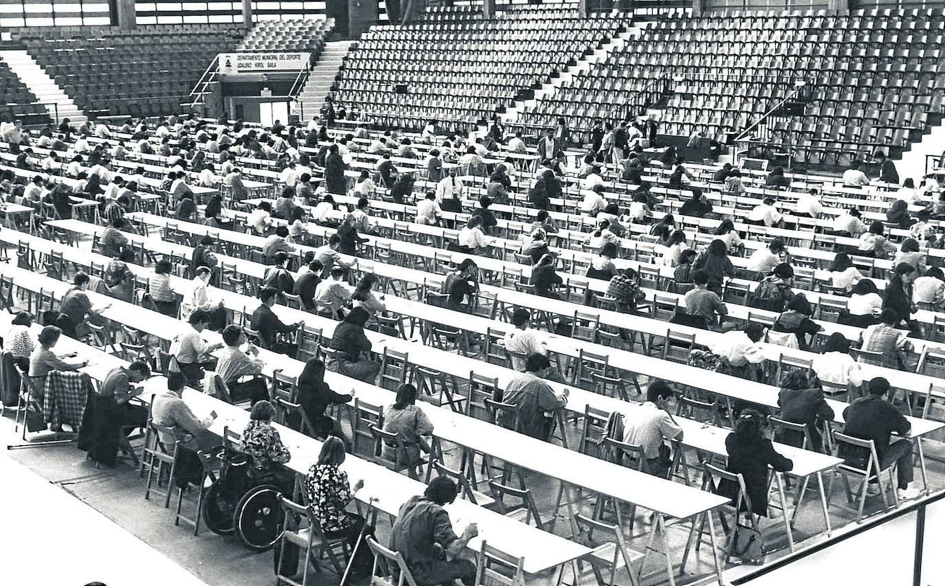 U n puesto de trabajo, y más si se corresponde con el de funcionario en la administración, cotiza siempre al alza. Las plazas que se ofrecen mediante concurso-oposición son en todos los casos infinitamente pocas comparadas con el gran contingente de aspirantes a obtener uno de los contratos que se someten a examen. El Ayuntamiento de Vitoria lanzó la oferta de empleo correspondiente al año 1993 en la primavera del año siguiente. Sacó 66 trabajos, 48 de auxiliar administrativo y 18 de vigilantes de tráfico-aparcamiento, la OTA, con 7.311 personas inscritas. 5.545 se apuntaron a la oposición de secretario y otras 1.766, a la de 'otero'. La institución recurrió a sus instalaciones deportivas para la realización de tan elevado número de pruebas. El polideportivo de Mendizorroza, en la imagen, recibió a solo una parte de los candidatos a administrativo el 29 de mayo de 1994.