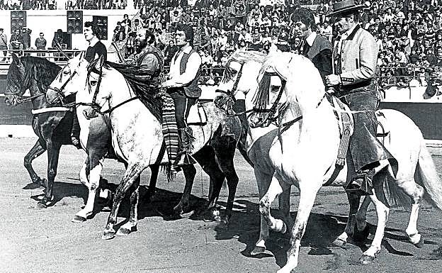 Curro Jiménez se convirtió en todo un clásico de la televisión española de la Transición. Entre 1976 y 1978, a lo largo de 52 episodios emitidos en la primera cadena, la serie fue relatando las fechorías de cuatro bandoleros comandados por Sancho Gracia en la Serranía de Ronda. Se enfrentaban a los franceses de la Guerra de la Independencia, asaltaban diligencias, robaban a los ricos para dar a los pobres, se emborrachaban en las posadas y hasta tenían tiempo para el amor. Un poco de todo esto se escenificó en la plaza de toros de Vitoria el 14 de mayo de 1978, un espectáculo itinerante con los protagonistas que aprovechó el tirón de la tele. Curro, 'El Estudiante' (José Sancho), 'El Algarrobo' (Álvaro de Luna) y 'El Gitano' (Eduardo García) deleitaron al público con un duelo de navajas, vida en la sierra, la horca y la diligencia. El rejoneador Álvaro Peralta lidió seis novillos.