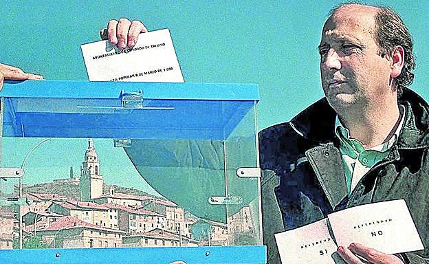 El 8 de marzo de 1998, los habitantes del Condado de Treviño se decantaron mayoritariamente por la convocatoria de un referéndum que les diera la oportunidad de votar por la desanexión de Burgos y su inclusión en Álava. Convocada por el Ayuntamiento del enclave, la consulta popular llamó a las urnas a 919 vecinos de Treviño y La Puebla de Arganzón para avanzar en la resolución de una disputa histórica por la territorialidad. Acudieron 705, de los que 477 votaron a favor de un referéndum vinculante (68,1%) y 221 (31,9%), en contra. Antes incluso del escrutinio, el Gobierno de España y la Junta de Castilla y León ya advirtieron de la «ilegalidad» de la votación y de su negativa a cumplir la voluntad de la mayoría resultante. Los treviñeses celebraron el triunfo de aquel 'sí' pero el condado sigue siendo burgalés. En la foto, el entonces alcalde Ernesto Argote 'ejerce' el voto.