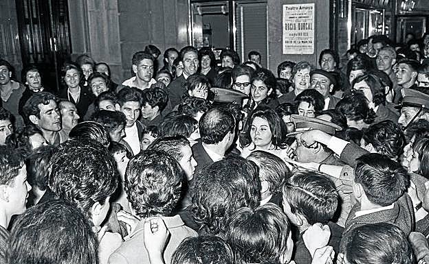 El 29 de abril de 1963, la entonces estrella del cine Rocío Dúrcal revolucionó Vitoria. Las crónicas de esos días recogen el despliegue de las fuerzas del orden ante la presencia de la joven artista de 18 años y del consiguiente revuelo de admiradores. A las tres de la tarde llegó al Canciller y a las cinco compareció ante los medios de comunicación. Tras atender a la prensa, a la que reveló su deseo de actuar con Paul Newman o Alain Delon, acudió al Teatro Amaya, invitada por su gerente, Antonio Ochoa, para que presentara su segunda película, 'Rocío de la Mancha', como figura en el cartel de la fotografía. En esos años, el gran teatro de la calle Paz, de promotores privados, organizaba festivales y traía estrenos exclusivos de las mejores películas del momento para tratar de hacer buena taquilla. Y convocaba, como es el caso, a las estrellas del celuloide como reclamo promocional. Dúrcal acudió ex profeso a Vitoria junto con su representante y su padre y al término de la presentación regresaron a Madrid.