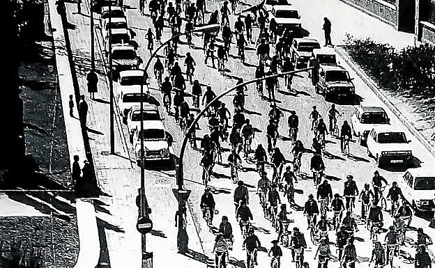 Hasta llegar a los actuales 171 kilómetros acondicionados en Vitoria para uso exclusivo o preferente de las bicicletas, muchos pequeños tramos se han ido trazando y empalmando entre sí desde aquel primero en los años 80. Hubo un tiempo que los 'bidegorris' eran una demanda que los ciclistas o vecinos decididos a moverse a ritmo de pedaleo por una ciudad que aún ni soñaba en 'green' trasladaban al Ayuntamiento con la insistencia de un martillo. Al otro lado de la petición estaba de alcalde José Ángel Cuerda, partidario de la bici y paseante ocasional, así que había quien sí escuchaba, por ejemplo, al Grupo Ecológico Alavés (GEA). La mañana del domingo 25 de marzo de 1984, unos 2.000 vitorianos se dieron con sus trastos un paseo plácido de 19 kilómetros urbanos custodiados por la Policía Municipal para recibir a la primavera pero, sobre todo, para exigir más carriles-bici. Ya estaba en servicio el de campo de los Palacios-Heraclio Fournier y había en proyecto otros tres, dos desde Abetxuko y uno en Santa Lucía, además de los paseos de Fray Francisco y Cervantes.