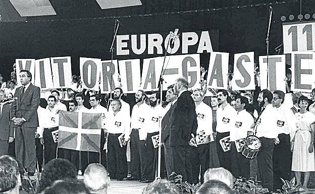 A la par que disfrutaba de sus fiestas patronales, a 2.200 kilómetros, en Pécs (Hungría), Vitoria recibía el 7 de agosto de 1988 su proclamación como capital mundial de la música coral en 1991. La Federación Europea de Jóvenes Corales, nacida en 1960 para derribar fronteras y unir a los pueblos a través del canto, la distinguió como sede del 11º Europa Cantat, el primero y hasta la fecha el único en España. Cada tres años, tan prestigioso festival reúne en torno a una ciudad a agrupaciones de los cinco continentes. En el caso alavés fueron 4.200 las voces que se dejaron oír en decenas de localidades, un evento cultural de primer orden que se disfrutó en gran medida por la repercusión de la que ya gozaba la Semana Coral Internacional promovida por Javier Cameno, entonces director de la obra social de la Caja Provincial. En Pécs no solo triunfó Vitoria, «una ciudad enclavada en esa bella tierra europea que es el País Vasco», ensalzó el director del certámen, Marcel Corneloup. También encandiló el coro Araba de Manu Sagastume completado con integrantes de la coral Samaniego. Se estrenó a su llegada con actuaciones improvisadas en las calles de Budapest. En Pécs actuó con acompañamiento de txistu, cantó con otros la 'Misa de la Coronación' de Franz Liszt y se despidió en la clausura (en la foto) con la pieza 'Europa Cantat, Vitoria-Gasteiz' compuesta dos días antes por Sabin Salaberri.