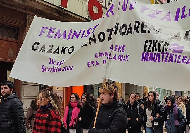 Respecto a Euskadi, la agrupación ha críticado que «el PNV no es un aliado de las mujeres trabajadoras y jóvenes». El colectivo estudiantil ha querido dedicar las manifestaciones de este 8 de marzo «al pueblo palestino, que está siendo masacrado». Durante la marcha se han proferido gritos de 'Boicot Israel, Palestina askatu'.