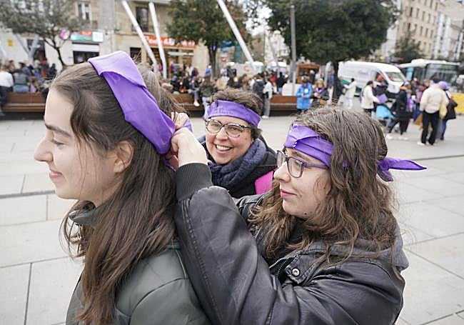 La tía de Aroa Pascual, que prefiere no dar su nombre, observa a su sobrina y a su amiga Ixone Aguirre, anudándose un pañuelo morado. Estas dos jóvenes, estudiantes de Educación Infantil, tienen 19 años y ya se han dado de bruces con el machismo. «Hace poco más de un año estaba esperando al bus y recibí unos comentarios despectivos. Hay veces que vemos estas cosas en la tele, pero están mucho más cerca de lo que pensamos», relata Aroa. Ixone reconoce que «hay veces que voy sola por la calle y no me siento segura». Para Agirre, «hay bromas que tenemos demasiado interiorizadas y que son machistas». Por eso confían en inculcar el respeto a los niños que, en un futuro no muy lejano, serán sus alumnos.