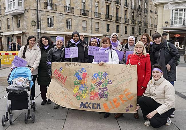 Irati Lamarca y Noha Mohaizen vienen con una pancarta multilingüe. Forman parte del colectivo Accen, integrado mujeres de diversos países. Noha, de hecho, lleva apenas un mes en Vitoria. Vino desde Palestina cuando estalló el conflicto y hoy reivindica «los derechos de las mujeres en todo el mundo, especialmente de las palestinas, que no tenemos derechos allí por culpa de Israel».