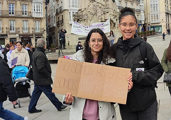 «No somos histéricas, somos históricas». Lucía Rodríguez y Maialen Santano han acudido con este lema en su pancarta a la manifestación del sindicato estudiantil de Álava . En el reverso de la pancarta lucen la frase 'gritando estoy más bonita porque calladita desaparezco'.