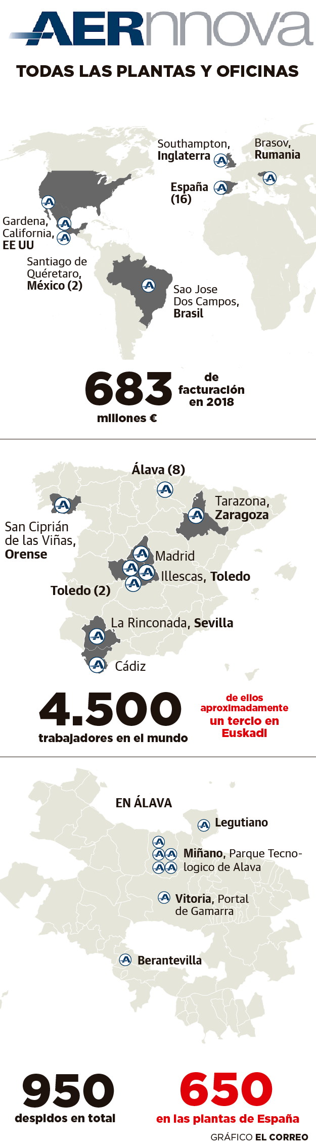 Nuevo mazazo en la línea de flotación de las economías alavesa y vasca. Otro referente industrial que anuncia medidas drásticas como consecuencia del brutal impacto ... de la crisis del Covid-19 en su cartera de pedidos y en la producción. Aernnova, líder mundial en el diseño y fabricación de aeroestructuras -alas, estabilizadores, fuselaje...- para los fabricantes de aviones, anunció su imtemción de despedir al 20% de su plantilla, lo que que se traduce en 950 personas; de ellas 650 en las plantas españolas y 300 en otros países del mundo.