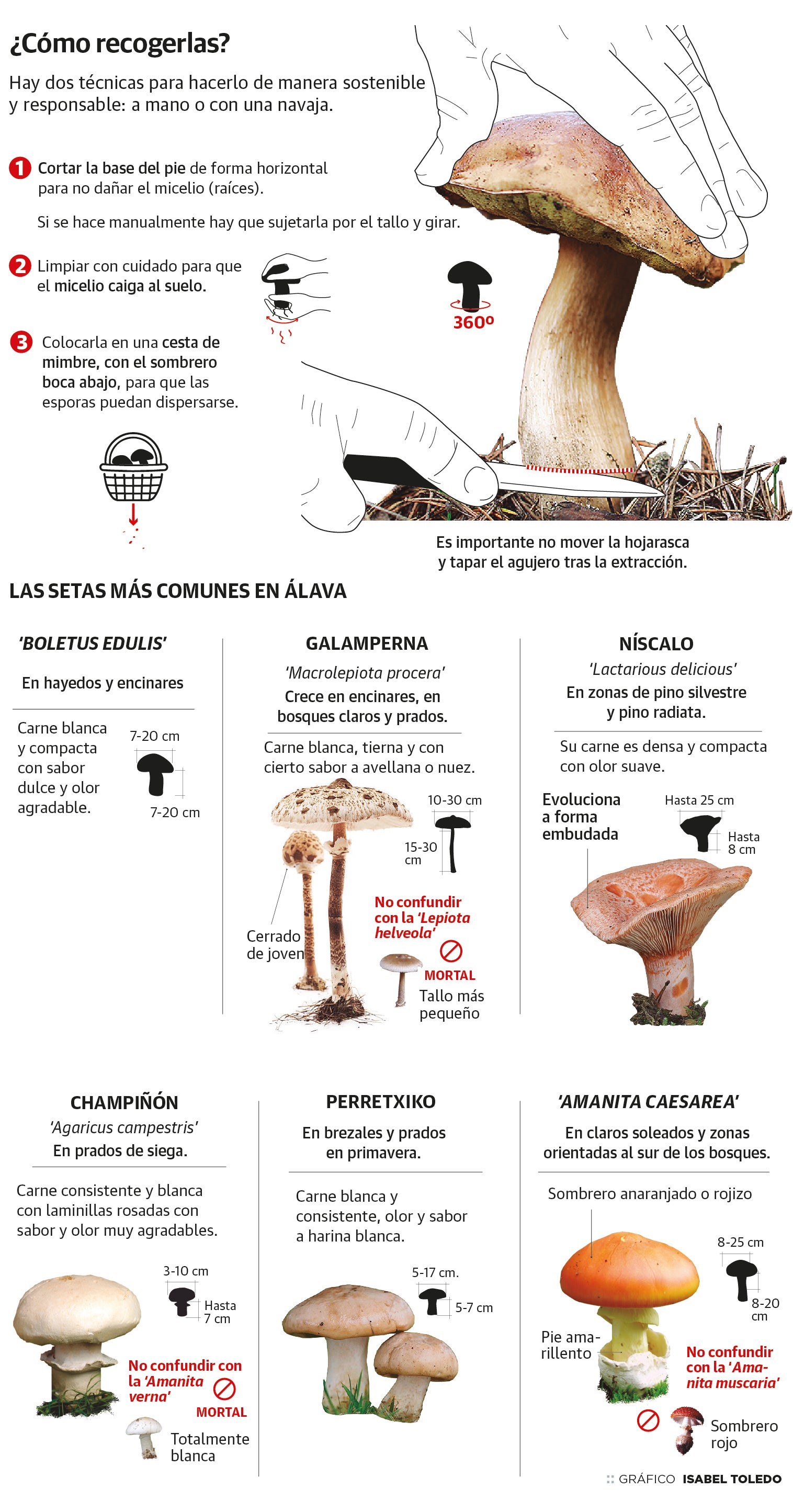 Hace ya dos semanas que los seteros han vuelto en masa a los montes vitorianos y ninguno de los que entienda un poco de este ... mundo de esporas y micelios regresa a casa con la cesta vacía. La temporada de setas de otoño no ha podido arrancar con mejor pie. Es «tremenda», «excelente», resume el guía profesional José David Fernández, de Micología para Todos. Hace ya días que lleva a grupos de todo tipo a adquirir nuevos conocimientos acerca de este mundo de setas y hongos y en sus paseos por los bosques alaveses ha visto buena cantidad de boletus, hongo beltza, mataparientes o hankagorri, níscalos, galampernas, cantharellus y trompetas de los muertos.
