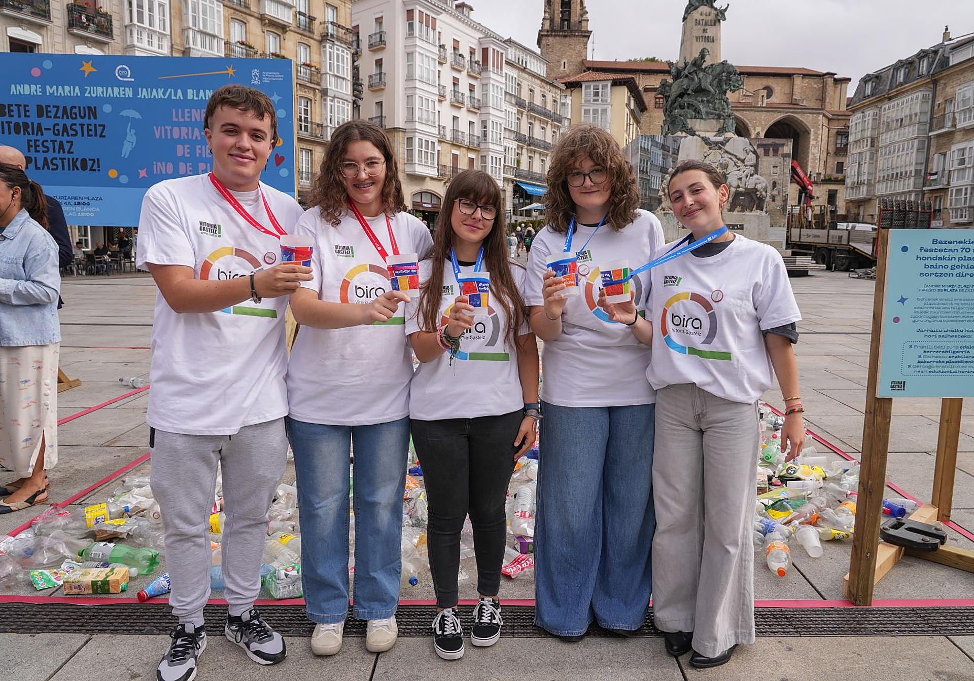 Seis jóvenes voluntarios –con tres turnos desde las 10.00 horas hasta las 20.00– de Egibide, llevan días sensibilizando a la ciudadanía desde la propia Plaza de la Virgen Blanca. Allí han colocado dos recuadros, uno vacío acompañado por un texto que hace referencia al estado de la plaza a las 12.00. Otro, un cuadrado cubierto por residuos plásticos en donde se indicaba que así quedaba la Virgen Blanca tras el chupinazo. Ibai y Andrea son dos de los voluntarios que han explicado que más allá de recoger residuos se trata de «visibilizar el problema y contagiar la conciencia». No reducen este problema únicamente a Vitoria y consideran que en las «fiestas de pueblo» también se podría seguir esta iniciativa. «Es una manera de concienciar a la gente que viene de fuera. Que piensen si esta ciudad lo está haciendo ¿por qué nosotros no?» ha manifestado Andrea.
