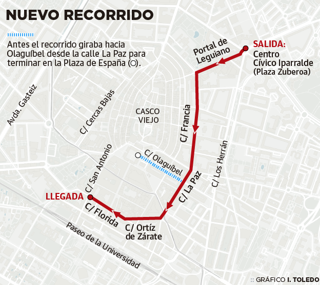 El recorrido evitará Olaguíbel y se desviará por la calle Florida, en un rodeo con el que el Ayuntamiento espera evitar aglomeraciones
