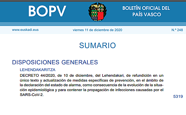 BOPV del 11 de diciembre de 2020 que regula la apertura de hostelería en Euskadi