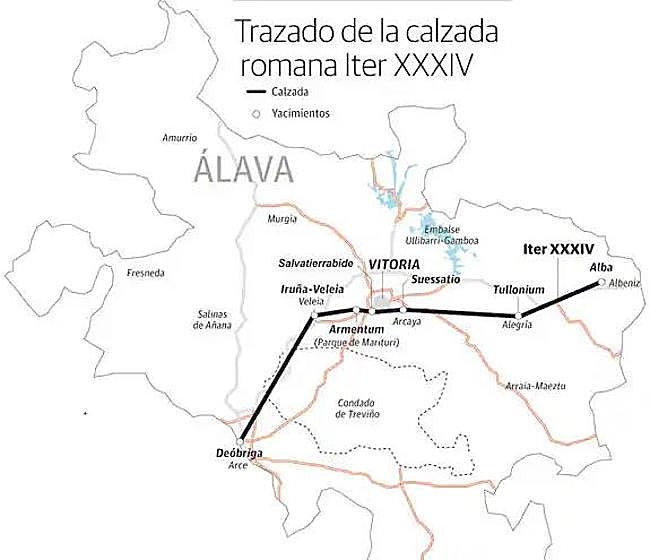 Roma fue una civilización de ciudades unidas por firmes calzadas. El mundo romano tuvo una gran presencia en Álava, con la ciudad de Veleia como máximo exponente poblacional y el Iter 34, como vía principal. Esta importante arteria, que a partir del siglo I unía las urbes de Asturica Augusta (Astorga, León) y Burdigala (Burdeos, Francia), aparece descrita en un texto del siglo III conocido como Itinerario Antonino. Es una especie de guía «de rutas interesantes para el imperio, quizá relacionada con los lugares por donde se movían los impuestos», aclara el arqueólogo de la UPV Rafael Varón. En este escueto listado de lugares donde descansar, denominados 'mansio', aparecen cinco puntos en el entorno de la actual Álava, conocidos en la época como Deobriga, Veleia, Suestatio, Tullonium y Alba. Por estas estaciones de parada oficial circulaba el correo imperial y viajeros de toda clase y condición, oficiales del Imperio e incluso el emperador.