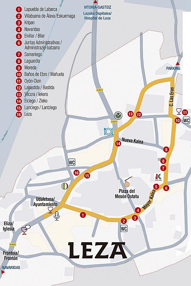Hay 16 puestos en los que podrá degustarse vino. Cada puesto representa a cada unos de los 15 municipios de Rioja Alavesa (Lapuebla de Labarca, Villabuena de Álava, Kripan, Navaridas, Elvillar, Samaniego, Laguardia, Moreda, Baños de Ebro, Oion, Labastida, Yécora, Elciego, Lanciego y Leza) y el decimosexto, a las Juntas Administrativas (Barriobusto, Labraza, Paganos y Salinillas de Buradón). Además, a lo largo del recorrido hay repartidos una treintena de puestos con productos artesanos y de cercanía.