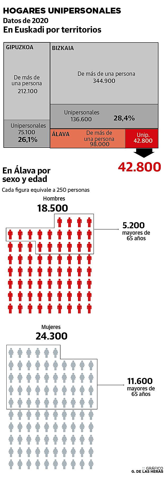 Primero, los datos. En menos de tres décadas la cantidad de viviendas de Álava en las que vive una sola persona se ha multiplicado por cuatro. En 1991, según cifras del Instituto Nacional de Estadística (INE), eran 10.015 los hogares unipersonales, mientras que en 2020 (último dato disponible) se habían disparado hasta los 42.800. El revolcón es enorme porque el territorio ha ganado población en estos treinta años –un 20,8%, de 276.547 a 333.940 habitantes– pero no tanta como para explicar el notable incremento de vecinos que han decidido o se han visto empujados a vivir solos.