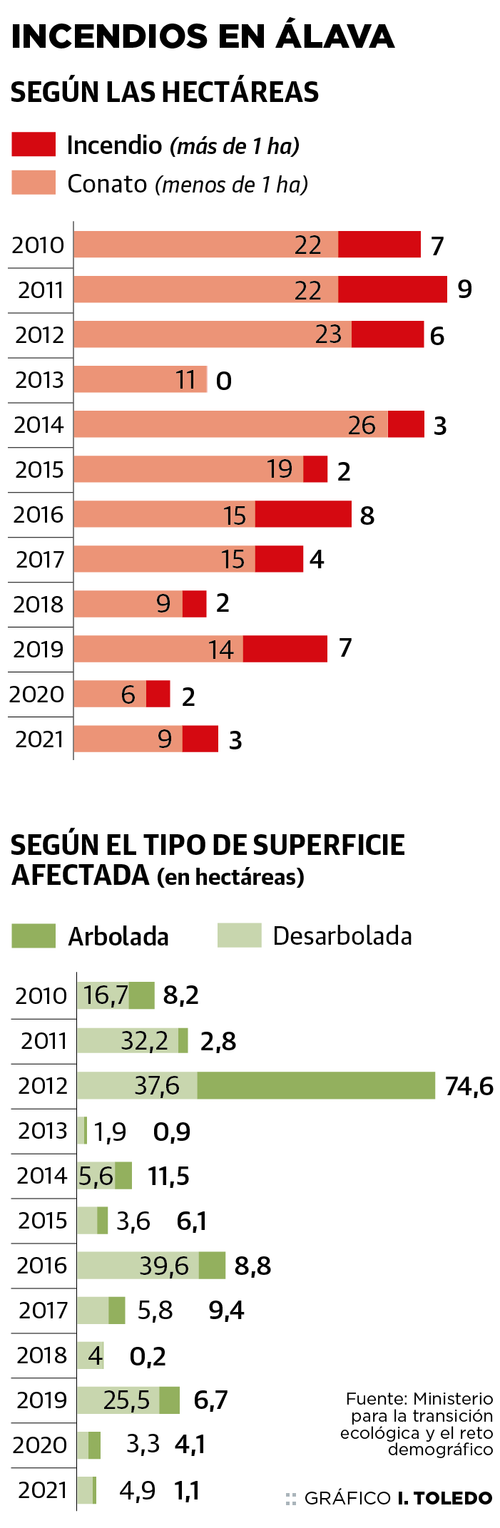 Este verano ha pulverizado récords. Si en España ya se ha quemado más superficie que en 2012 –hasta ahora el peor año en incendios–, Álava ... va camino de acabar el estío con más terreno abrasado que en los últimos doce años juntos; 315 hectáreas durante todo ese periodo frente a las 360 que, según las primeras estimaciones de la Diputación, han sido pasto de las llamas entre zonas forestales y agrícolas en los últimos dos meses.