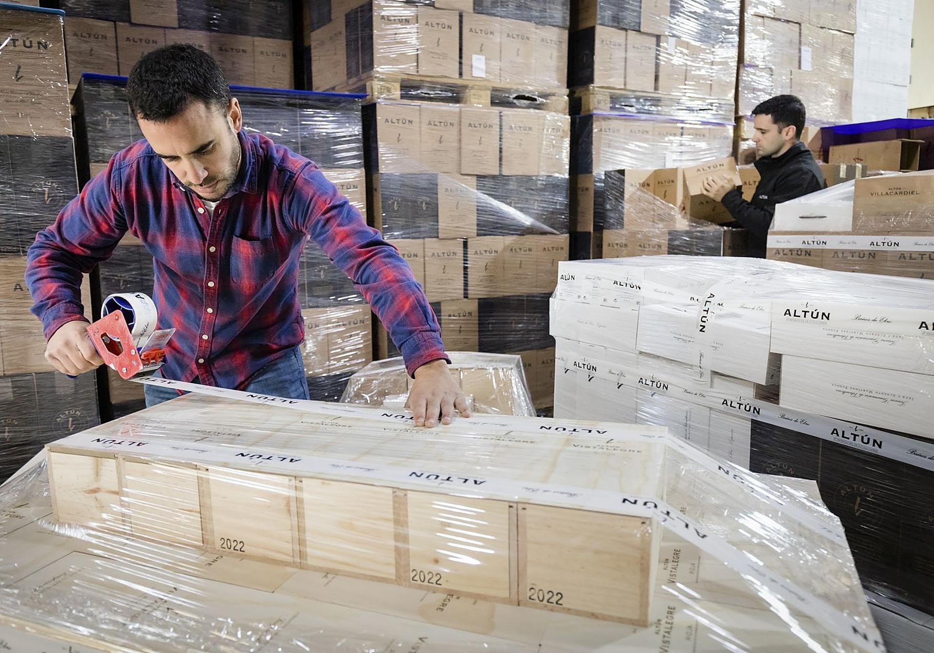 2.000 frascos se embotellan a la hora en una máquina encargada también de colocar el corcho, encapsularlo, dejar impoluto el vidrio y etiquetar en la posición precisa todas esos litros que Alberto e Iker colocarán con sumo cuidado en cajas y empaquetarán en palés que saldrán desde Baños de Ebro a otros puntos del País Vasco, La Rioja o Castilla y León.