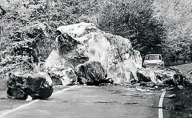 Un imponente trozo de roca, de unas quince toneladas de peso, y otros tres más pequeños se desprendieron de la ladera del monte y cayeron sobre la carretera del puerto de Herrera, la A-2124, entre Peñacerrada y el cruce de Leza, en el paraje conocido como la 'cuesta de las Churdinas' al amanecer del sábado 12 de mayo de 1984. La circulación de vehículos se interrumpió de inmediato y durante todo el fin de semana el tráfico con dirección a Laguardia se desvió por el puerto de Ribas de Tereso para enlazar con la N-232 a la altura del cruce de San Vicente de la Sonsierra. En el lugar del percance, los Miñones alaveses pudieron comprobar que el gran tamaño y peso de las piedras caídas hacían imposible su retirada con la simple utilización de excavadoras y camiones, así que se apostó por la voladura controlada de los bloques mediante el empleo de pequeñas cantidades de explosivo. Ingenieros de la Diputación y agentes del cuerpo de policía foral supervisaron las operaciones de detonación y retirada de los restos hasta la reapertura de la carretera al tráfico rodado dos días después.