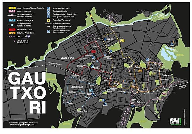 La línea G2 contará con tres paradas de bajada a demanda, las tres ubicadas en el barrio de Goikolarra; mientras que la línea G3 tendrá una parada de este tipo en Armentia. Eso sí, no se autorizarán subidas en estos puntos.