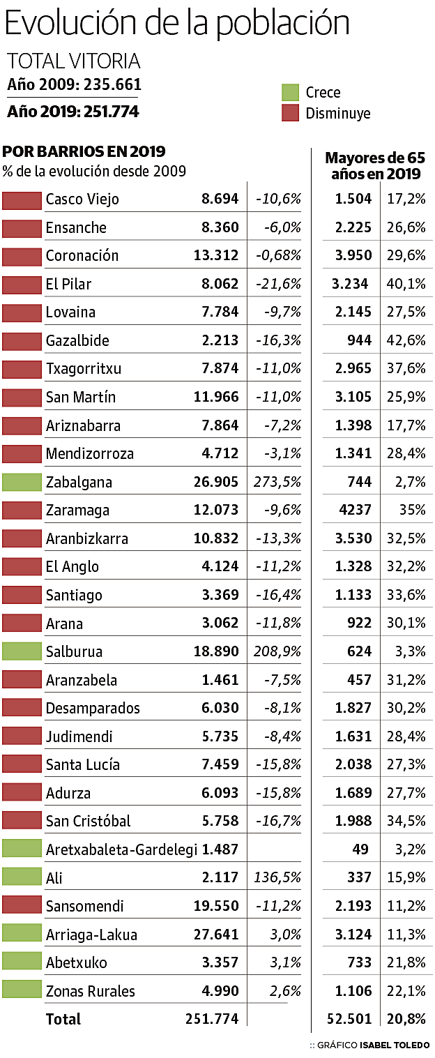 Con los habitantes de Salburua y Zabalgana se podría abarrotar tres veces el Buesa Arena, ocupar todas las butacas de cincuenta teatros como ... el Principal o repetir la participación en la última media maratón de Vitoria durante quince ediciones. Casi 46.000 personas alimentan hoy el padrón de los barrios más jóvenes de la ciudad, el triple que hace una década. El último análisis del INE, cerrado a 1 de enero de 2019, evidencia el éxodo poblacional hacia ambas zonas –con subidas en su censo por encima del 200% desde 2009– mientras se desangran barrios como El Pilar, Santiago o San Cristóbal. La ciudad ha mutado, y mucho, en diez años. No sólo por el trasvase de vecinos hacia sus extremos, unos 32.500 en este tiempo con un escaso 3% de residentes que han cumplido los 65, sino también por el imparable envejecimiento del resto de la urbe y la constante llegada de extranjeros, el auténtico 'motor' de su crecimiento con el colectivo marroquí a la cabeza.