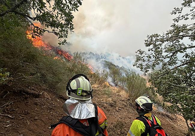 Desde primera hora de la mañana los efectivos llegados desde Euskadi habían estado trabajando cerca de la localidad de Vegacerneja para abrir una vía de escape. El problema fue que las condiciones empezaron a empeorar en torno a las tres de la tarde: la temperatura subió, la humedad bajó en picado y empezaron a percibirse rachas de viento de unos 40 kilómetros por hora. El resultado fue que las llamas volvieron a acechar la aldea de Casasuertes y había que actuar rápido.