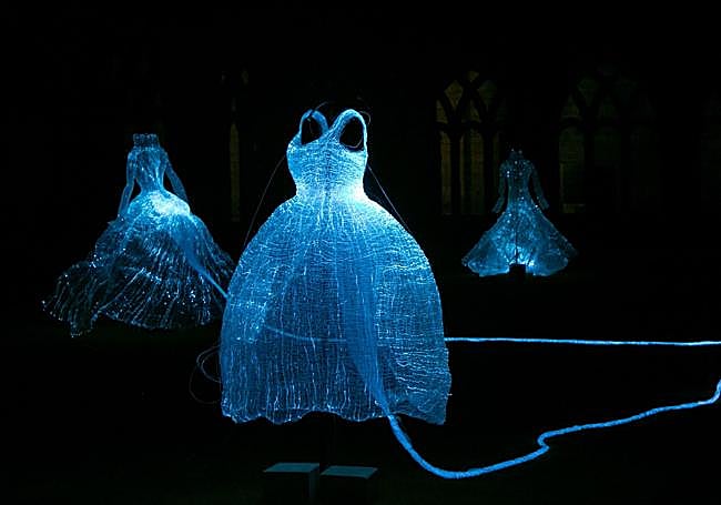 Inspirado en El discurso del amante de Roland Barthes, DRESSES explora el deseo de fusionarse con un amante, simbolizado a través de vestidos extravagantes hechos de cientos de hilos de fibra óptica. Suspendidos en la oscuridad, los vestidos brillan y cambian de color, representando sus historias evolutivas de amor, intimidad y transformación. Cada vestido cuenta una historia única, invitando tanto a la adoración como a la inmersión, mientras refleja la profunda conexión entre dos personas, convirtiéndose en una metáfora de la unión, el cambio y el paso del tiempo. La instalación evoca la fantasía de convertirse en uno solo con un amante.