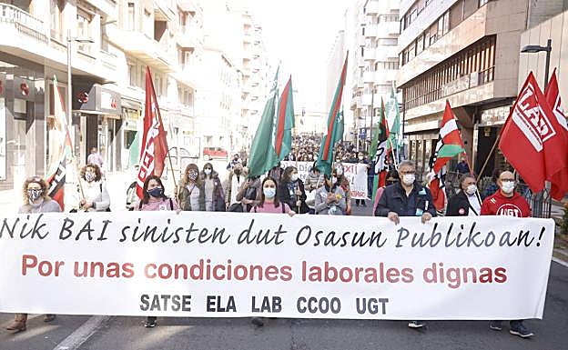 El momento más álgido de la jornada de protestas por el «maltrato» que Osakidetza da a sus «saturadas» plantillas se vivió a mediodía con las tres manifestaciones que recorrieron las capitales vascas. En Vitoria, la marcha partió desde el hospital Santiago en dirección a Lehendakaritza y contó con la participación de cientos de trabajadores y colectivos de pensionistas que también apostaron por una «sanidad pública de calidad», la reapertura de la Urgencias de Santiago y por el regreso de las consultas presenciales.