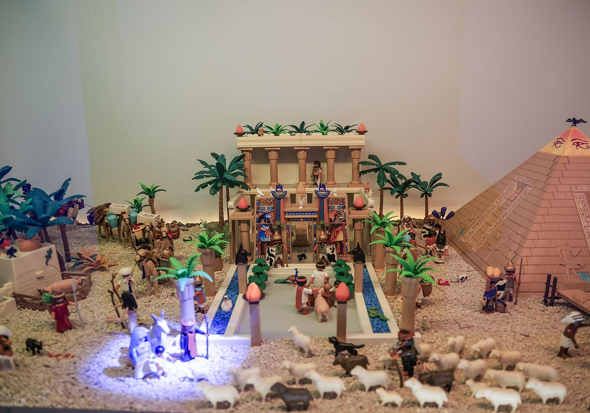 La muestra reserva un espacio con figuras menos clásicas. En una maqueta realizada con muñecos Playmobil se representa la huida a Egipto de la Sagrada Familia, mientras que en una esquina aparecen los Reyes Magos, Papá Noel y Olentzero retratados «de vacaciones», vestidos con camisas hawaianas y cámara al cuello «disfrutando de su jubilación como auténticos turistas».