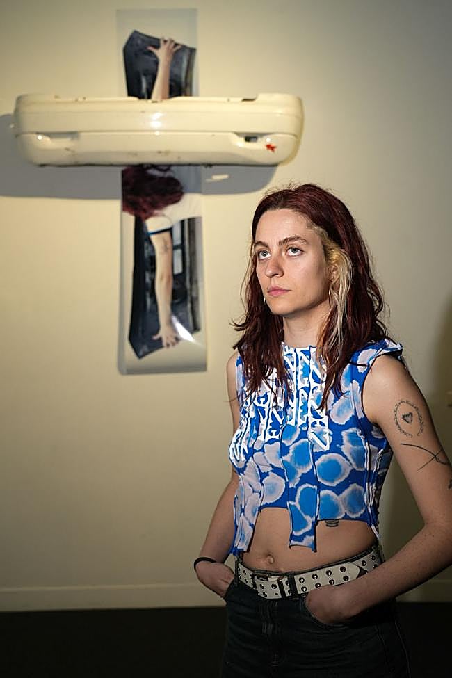 Sobre la exposición reciente, otra curiosidad. La cruz que se ve en una de las paredes -formada por la combinación entre una fotografía de su cuerpo abriendo los brazos y un parachoques blanco- fue una decisión de última hora. «Surgió en el montaje, pero es algo que me gusta hacer, guardarme alguna creación para este momento», apunta. «El espacio lo entiende como arquitectura», describe Ane Berganza, una de las compañeras que le ha ayudado en la instalación que toma como punto de partida elementos cotidianos, comunes para todos.