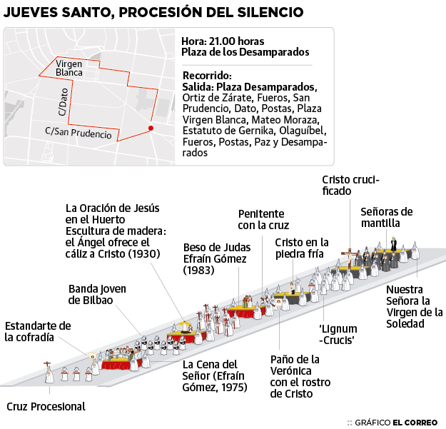 Superado este escollo, este año se ha sumado una nueva piedra en el camino. Los nazarenos tropezarán con las obras de la futura Plaza de la Memoria, en marcha desde el pasado enero. Si en su última salida la comitiva bajó desde Mateo Moraza por Lehendakari Aguirre hasta la calle Postas, esta vez los cofrades tendrán que rodear el Memorial de las Víctimas del Terrorismo para llegar a Olaguíbel y ahí empezar un zig-zag a través de Fueros, Postas y Paz para devolver las preciadas tallas a su depósito en la Iglesia de Nuestra Señora de los Desamparados.