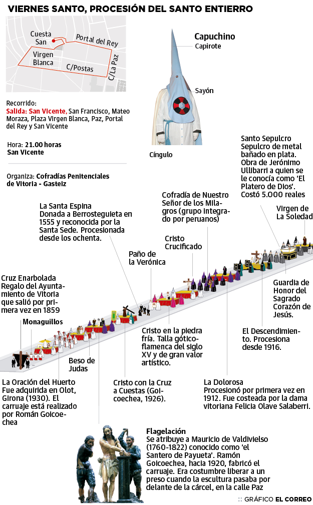No frecuentarán la austera Semana Santa vitoriana fieles enfervorecidos, ni los balcones se engalanarán con finos pendones, ni se colocarán gradas para los VIP. No habrá toques de corneta y apenas saetas pero, los nazarenos alaveses están seguros de que su fiesta es tan intensa y sentida como para el sevillano su Macarena.