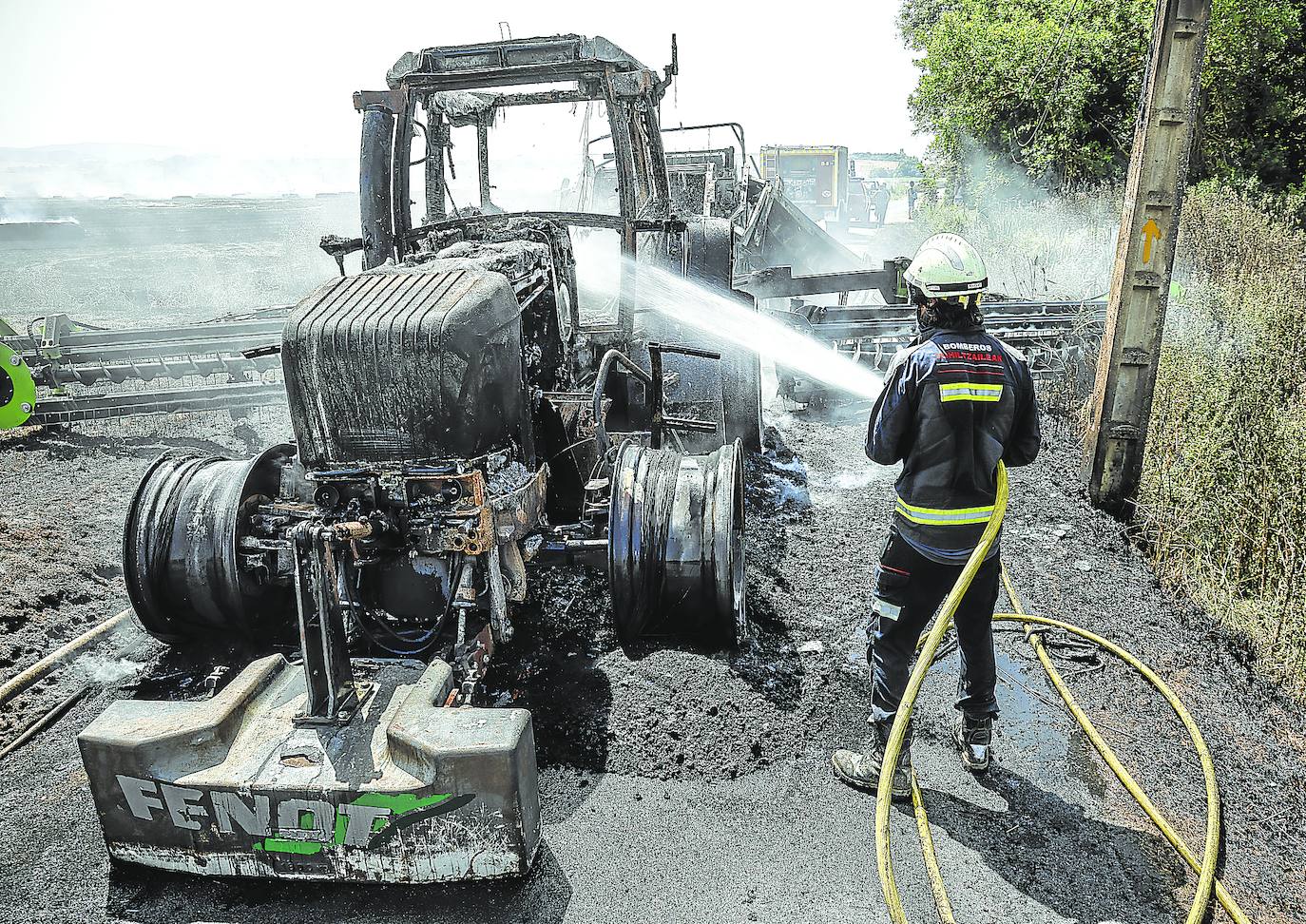 El fuego también arrasó justo antes las tierras de Juanjo Galdós, pero él corrió algo más de suerte. «Había cosechado la finca hace solo dos días», decía lamentando que la paja que ahí quedaba no relantizara el incendio. «El cereal sin cosechar prende más rápido», atinaba sin quitarse el susto y esa imagen... «Estaba ayudando a cosechar a un amigo en Añúa cuando vi el humo. Vinimos a todo correr. Al llegar a Villafranca oímos dos explosiones, eran los neumáticos del tractor. Estaba ardiendo en medio del camino».