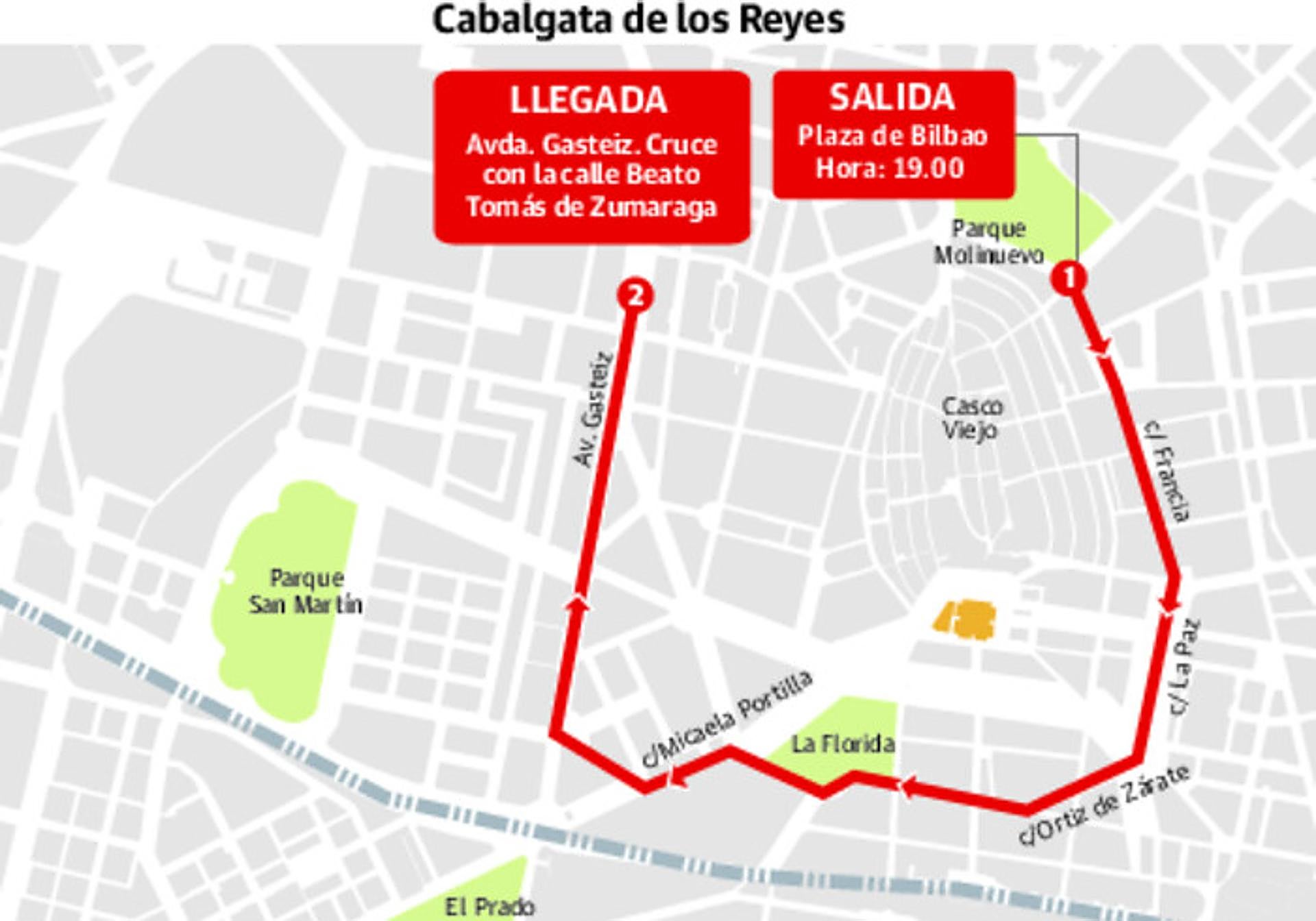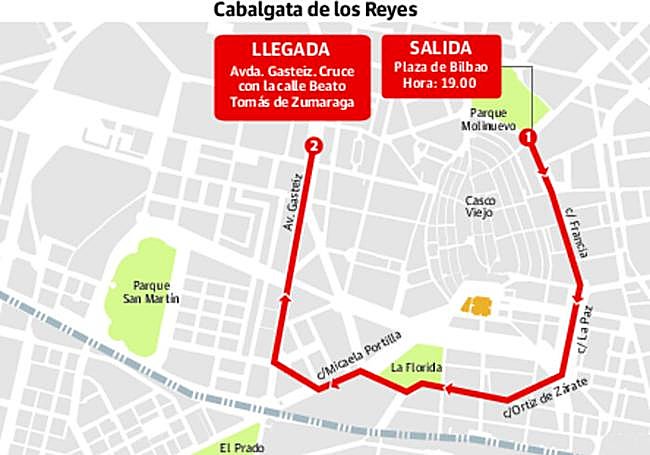 El desfile comenzará en la plaza de Bilbao y discurrirá por las calles Francia, La Paz, Ortiz de Zarate, Florida, Ramón y Cajal, Micaela Portilla, Lascaray y la Avenida de Gasteiz. El final de la cabalgata será en el cruce de la Avenida de Gasteiz con Beato Tomás de Zumarraga.
