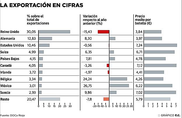 ¿Y Estados Unidos? Pese a ser un mercado con un sistema complejo para el producto llegado de fuera -requiere venta a importador, de este a distribuidor y de este a detallista- se ha convertido en el tercer cliente de Rioja con el 10,46% de la tarta.