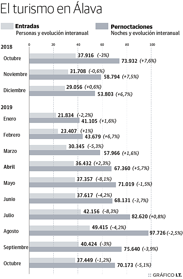«¡Ojalá el año que viene sea como éste!». La frase, en la que coinciden directores de distintos hoteles y alojamientos turísticos de Vitoria, sirve ... para reflejar cuál será el balance del sector en 2019: «Muy bueno». Ello a pesar del jarro de agua fría que, mes a mes desde prácticamente el inicio de año, se ha ocupado de difundir el Eustat, el Instituto Vasco de Estadística. Sus cifras oficiales apuntan a que, de los diez meses hasta octubre, en ocho se han producido descensos en el número de turistas. Los profesionales no ven por ninguna parte esta caída en la llegada de visitantes a los hoteles.