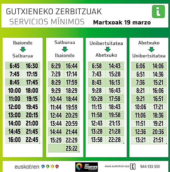 Ante la convocatoria de huelga, Euskotren, sociedad Pública perteneciente al Departamento de Planificación Territorial, Vivienda y Transportes del Gobierno vasco, garantizará este martes la prestación de servicios mínimos en sus líneas de tranvía, ferrocarril, metro, carretera y funicular. De acuerdo con la orden dictada este lunes por el Departamento de Trabajo y Empleo, los distintos modos de transporte que opera la compañía mantendrán un 30% de su actividad ordinaria.