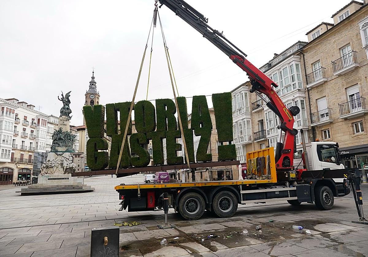 La ciudad está preparada para La Blanca con el monumento a La Batalla de Vitoria protegido y el cable para la bajada de Celedón colocado