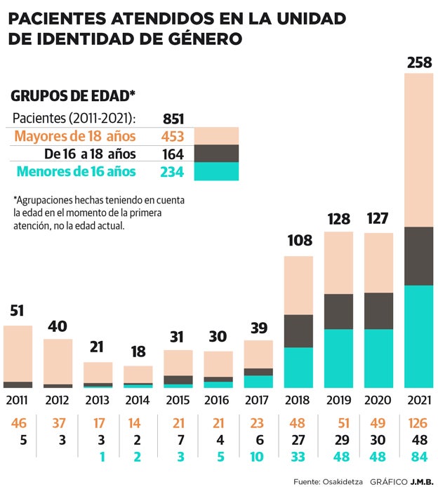 En Osakidetza hay una unidad que arropa y acompaña a estas personas en este tránsito. Es la de Identidad de Género (UIG) de Cruces, en Bizkaia, para todo Euskadi. Creada en 2009, ha atendido a 851 usuarios desde su puesta en marcha. Amets es uno de ellos. Este equipo ha visto cómo en el último lustro se ha producido un incremento «exponencial» de los usuarios que reciben. Durante sus primeros años de funcionamiento la unidad ha atendido a entre 18 y 51 pacientes por ejercicio. En 2018 se produjo el primer gran aumento. Trataron a 109. El segundo ha tenido lugar el pasado año. Asistieron a 258 personas en su proceso de tránsito. De ellos, 132 eran menores de edad y 84 aún no habían cumplido los 16 cuando acudieron a su primera consulta, según los datos facilitados por el hospital de Cruces.