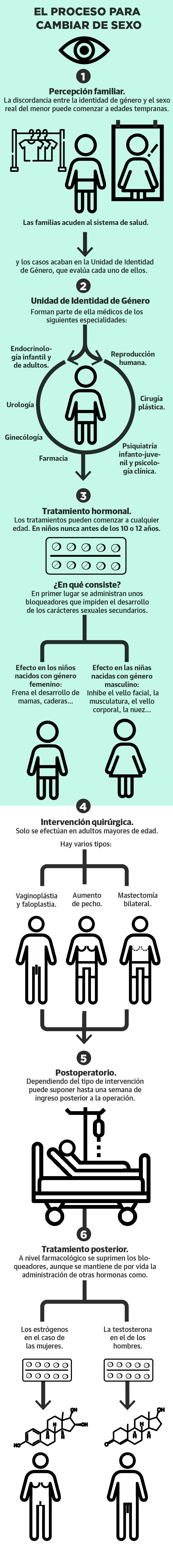 Si al iniciar la pubertad esta persona mantiene una identidad de género diferente a la del sexo que se le asignó al nacer, y esto le genera malestar, podría iniciar un tratamiento farmacológico. Esto no ocurrirá nunca antes de los diez o doce años. Consiste en administrar «unos bloqueadores de la pubertad» por los que dejan de segregar testosterona o estrógenos. «Impiden también que se desarrollen los caracteres secundarios como la nuez, el vello facial, el pecho...», detalla Rica. Entre los factores relevantes de esta medicación, destaca la especialista, está el que es un tratamiento reversible. En caso de que se deje de tomar, el cuerpo vuelve a generar las hormonas propias del sexo con el que nació. «Por eso se puede empezar con él a una edad temprana», aclara.