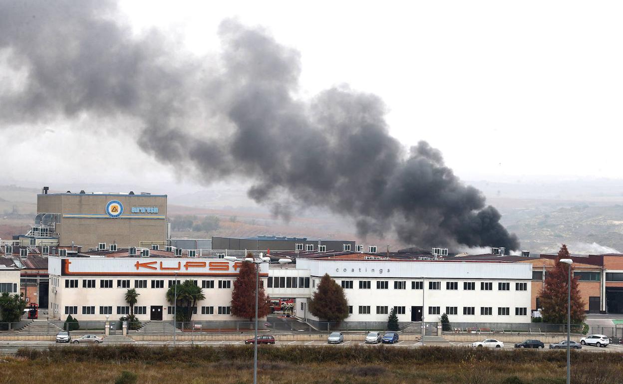 Incendio en la fábrica de barnices Kupsa, en el polígono industrial de Oion, junto a Logroño. Un trabajador ha sido trasladado al hospital San Pedro al sufrir quemaduras en su cuerpo. El incendio ha comenzado a las 12.45h en un pabellón y se ha propagado a tres más @rtvenoticias pic.twitter.com/pcg2dS4v6Z