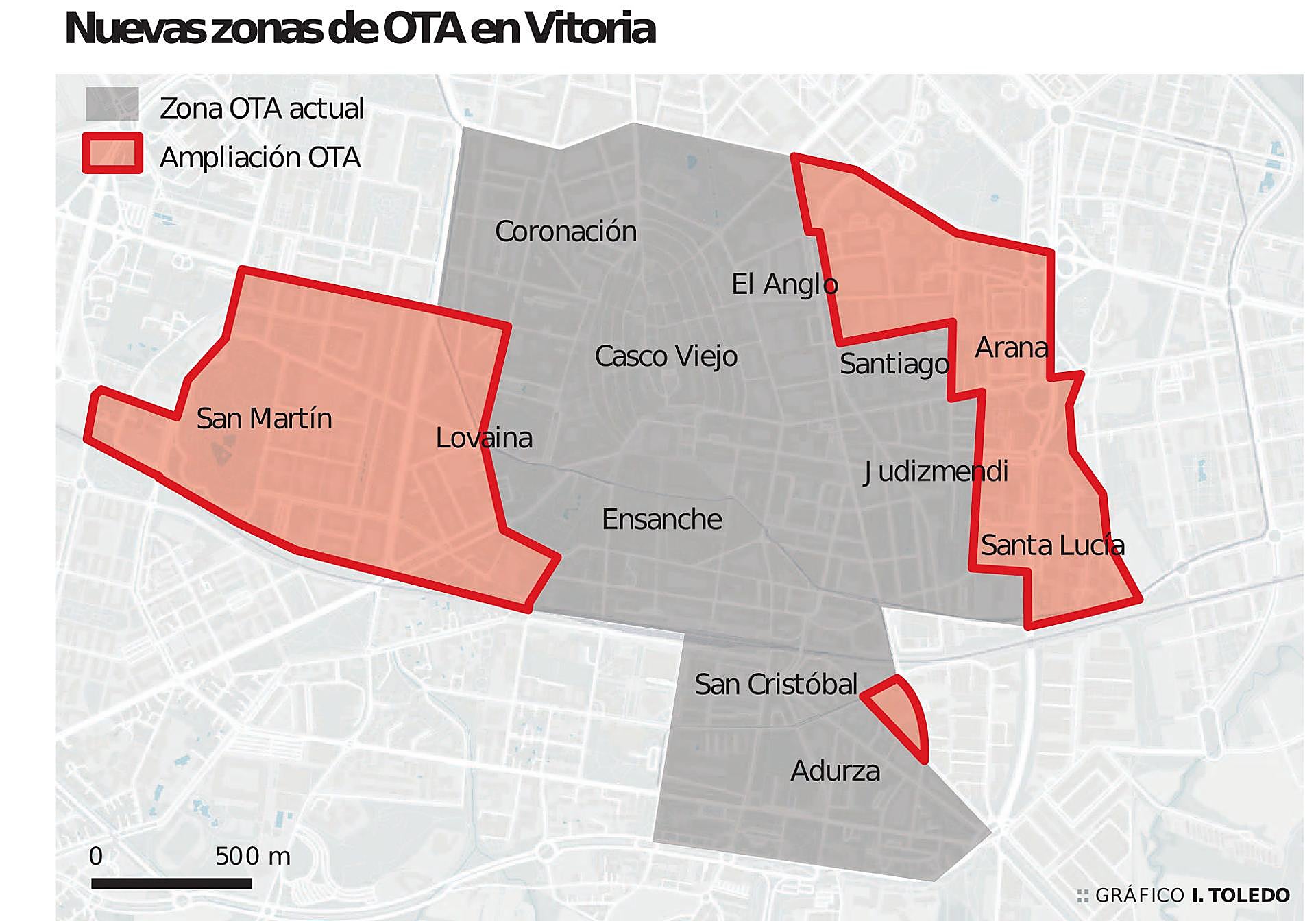 Nueva zonificación. Los barrios y calles que pasan a ser de pago. La nueva zona de OTA incorpora a los barrios de Aranbizkarra, Arana, Santa Lucía, San Martín, Lovaina y Aranzabal. A su vez, se implementará en la zona de bajas emisiones (Casco Viejo y parte del Ensanche) y en la calle Las Trianas. Habrá una nueva zonificación.