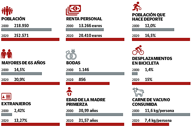 En 20 años la capital vasca ha visto nacer dos barrios y multiplicarse por seis los extranjeros. Hoy se espera a tener hijos hasta los 31 y sólo el 16% se da el sí quiero en la iglesia