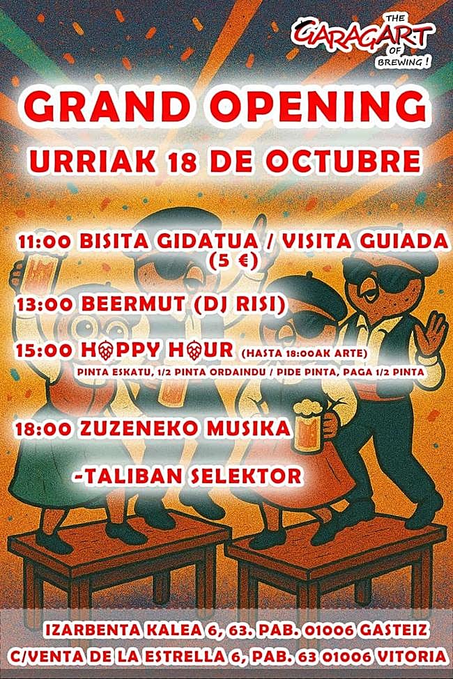 De los depósitos de fermentación al barril y al vaso. Más fresca imposible. En esos grifos no faltarán las populares 'Gorritxo', su amber ale de cabecera, o la ipa 'Hopster Party'; pero se podrán degustar otras elaboraciones más recientes como 'Buruz Buru' (pils checa), 'No estábamos de parranda' (modern ipa) o 'Lagunartian' (hazy pale ale). Además de latas, picoteo…
