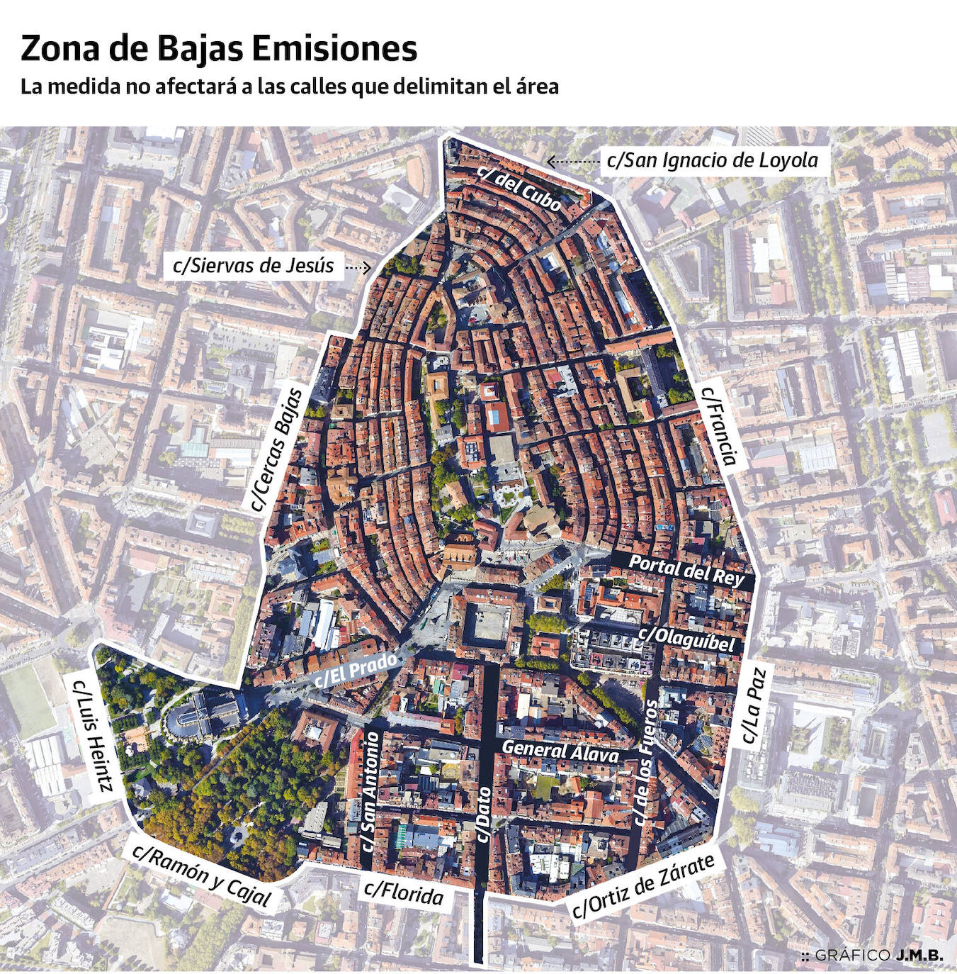Uno de cada tres coches que ahora acceden a varias calles del Casco Viejo y del Ensanche tendrá prohibida su entrada en la futura Zona ... de Bajas Emisiones (ZBE). El Ayuntamiento ha cifrado en un 30% el «tráfico de paso» en zonas del centro y de la 'almendra' donde se aplicarán las restricciones. Es decir, en todo el distrito histórico y en vías como Portal del Rey, Olaguíbel, General Álava, San Antonio y el Ensanche peatonal. Este es precisamente el tipo de circulación que busca eliminar la norma, obligatoria para las ciudades de más de 50.000 habitantes para mejorar la calidad del aire. En el caso de Vitoria, se activará en el «último trimestre» del año.