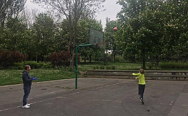 Lo que más echa en falta Egoitz Fuente es ver a sus amigos de la ikastola Ikasbidea y «jugar al fútbol». En tiempos de pandemia ha cambiado el cuero por el naranja del baloncesto, porque así puede lanzar a canasta con su aita. «No lo ha llevado mal», reconoce su padre, Kepa, que es sanitario. Los dos han bajado pertrechados con guantes, para evitar el contacto de la piel con el balón, que sí toca el suelo.