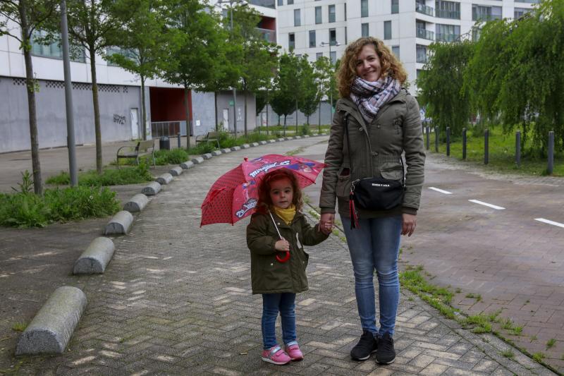 «Ponte lejos de las chicas, 'mami'». Iraia disfruta con precaución y su paraguas rojo de Ladybug de su primer paseo y no deja que las periodistas se le acerquen demasiado. Su madre, Beatriz de los Bueis, espera que salir a la calle ayude a que la pequeña «no tenga rabietas». «Con ella hoy no me he puesto la mascarilla. Con este día de lluvia no hay casi nadie por la calle», se justifica esta vecina de Zabalgana.