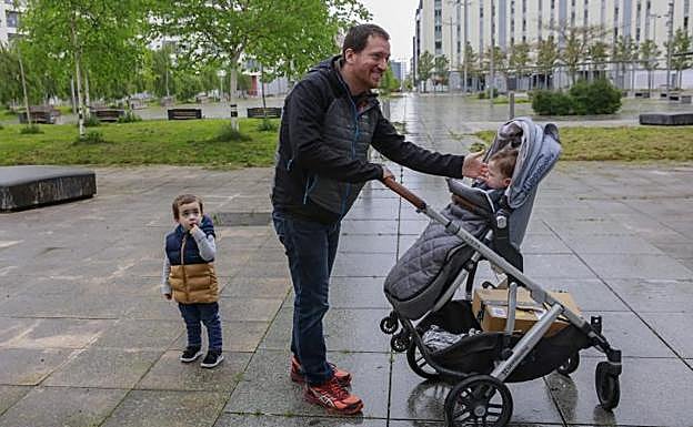 Ander y Naia han paseado con su padre, Héctor Pérez, por el barrio de Zabalgana, «¡Tenía ganas de ver las palomas!», exclama Ander. Su aita encuentra un alivio poder salir a dar una vuelta con ellos. «Mi mujer y yo teletrabajamos y a veces se hace difícil amoldarse», confiesa. Esta mañana se preguntaba si debía haberse puesto una mascarilla para pasear con los pequeños y reciclar los cartones.